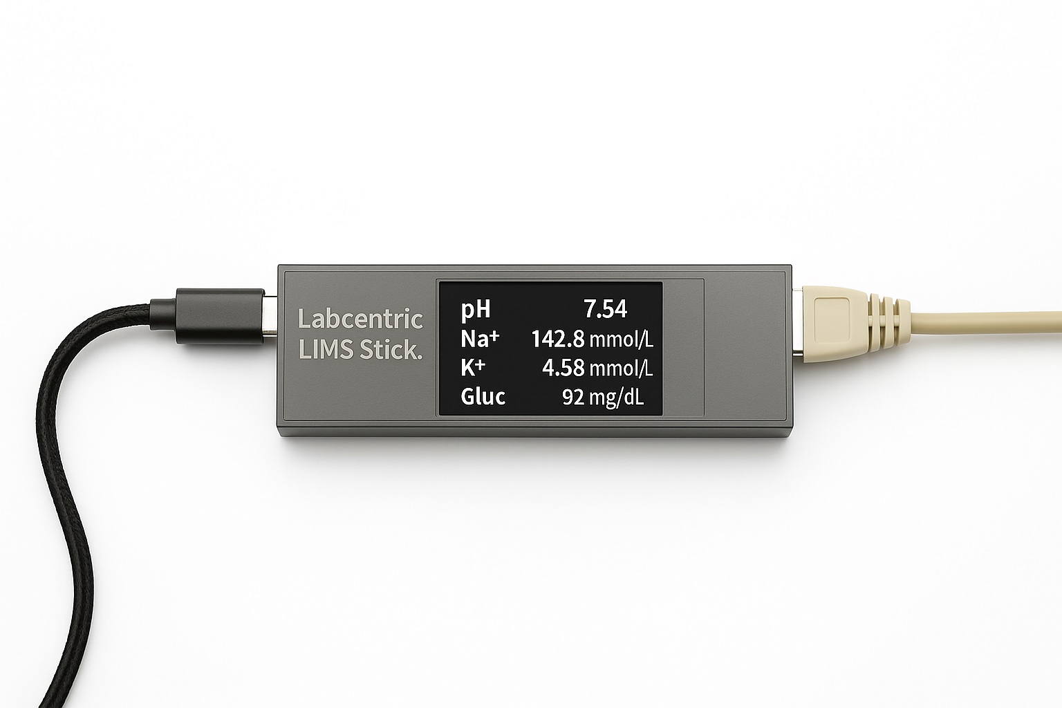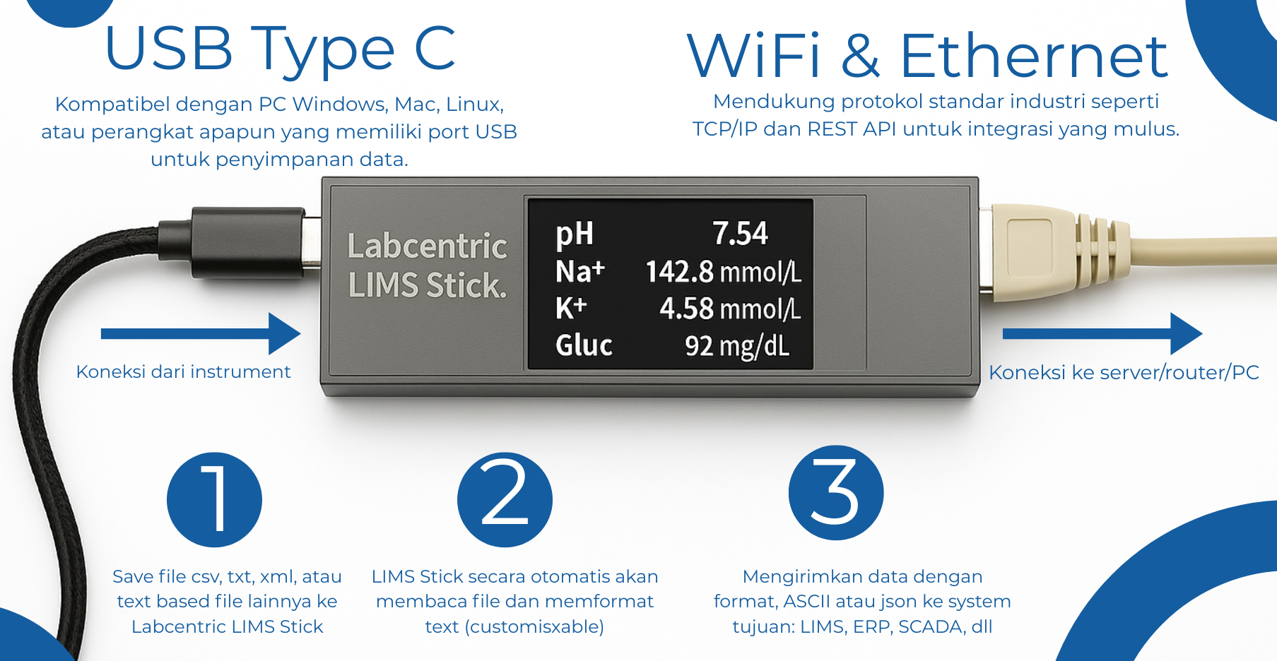 LIMS Stick membaca data dari port USB instrumen atau PC (seperti flashdisk biasa), lalu mengirimkannya secara otomatis ke sistem LIMS Anda melalui Wi-Fi atau Ethernet.